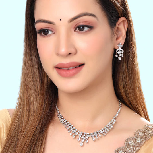 Jewellery Set for Women and Girls American Diamond Jewellery Set | Silver Tone Drop Designed White AD Necklace Set | Birthday Gift for girls and women Anniversary Gift for Wife
