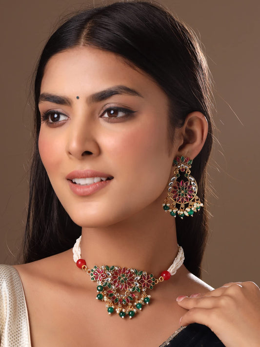 Jewellery Set for Women and Girls Kundan Jewellery Set for Women| Gold Tone Pink Meenakari Kundan Choker Necklace Set | Birthday Gift for girls and women Anniversary Gift for Wife