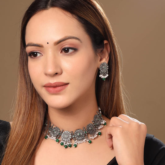 Jewellery Set for Women and Girls Choker Set for Women | Silver Tone Green Pink Beads Drop Choker Necklace Set for Women | Birthday Gift For Girls and Women Anniversary Gift for Wife