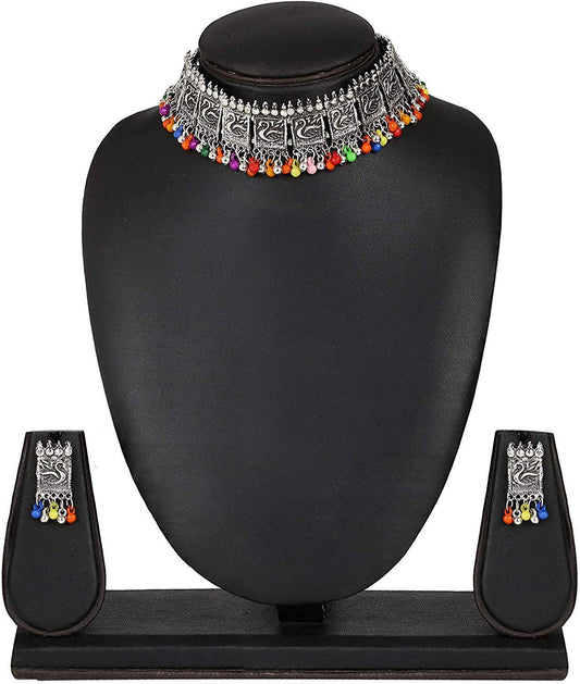 Exclusive Antique Peacock Design Vintage Style German Oxidised Silver Beads Choker Necklace Set with Drop Earrings Jewellery Set for Women and Girls