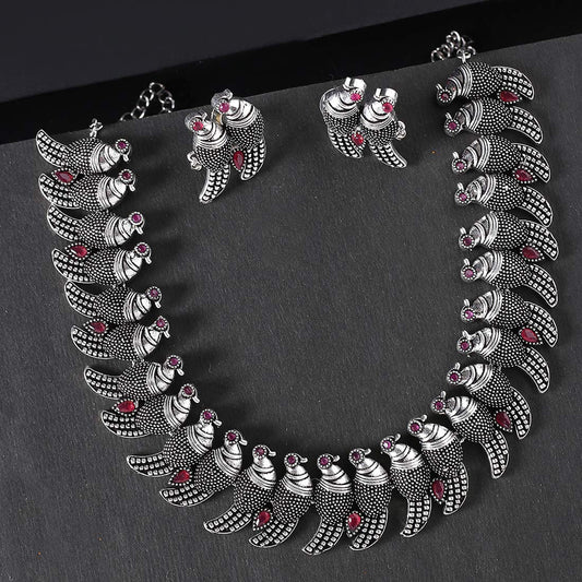 Antique Look Genuine German Silver Oxidised Jewellery Set Designer Parrot Carved Choker Necklace Set for Women and Girls