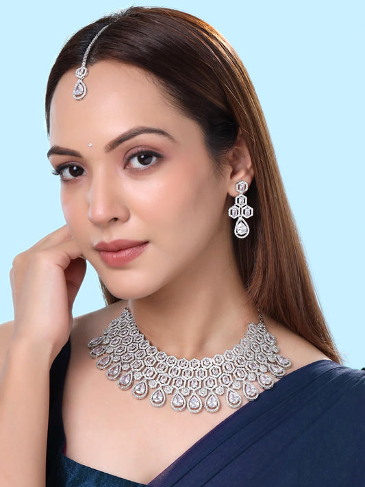 Jewellery Set for Women and Girls American Diamond Jewellery Set | Silver Tone Drop Designed Broad White AD Necklace Set | Birthday Gift for girls and women Anniversary Gift for Wife