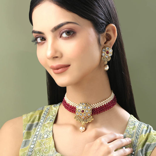 Jewellery Set for Women and Girls Kundan Necklaces Set | Gold Plated Beads Beaded Kundan Choker Necklace Set | Birthday Gift for girls and women Anniversary Gift for Wife
