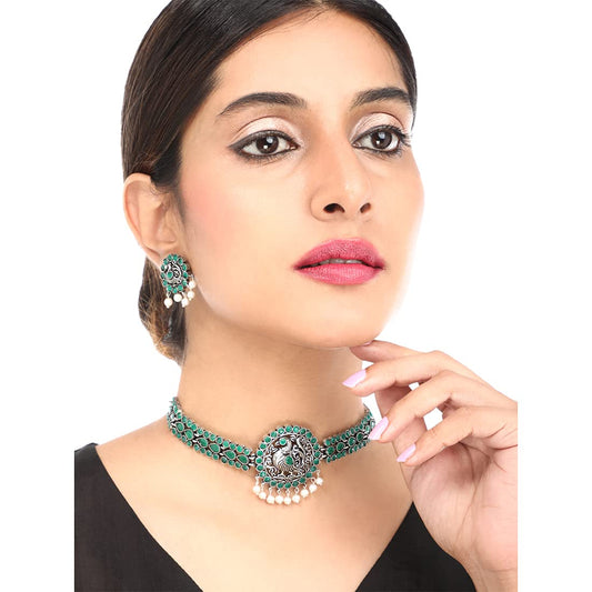 Ethnic German Silver Oxidised Green studded stones Peacock Design Choker Necklace Set with Earrings Traditional Jewellery Set for Women and Girls, Medium (YCTJNS-55PCKSTN-GR)