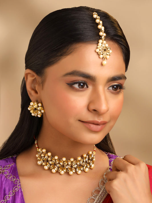 Kundan Jewellery Set Gold Plated Traditional Choker Necklace Set Gold Plated and Pearl Jewellery Set for Women (Golden) (YCTJNS-05FLWKUN-GL)