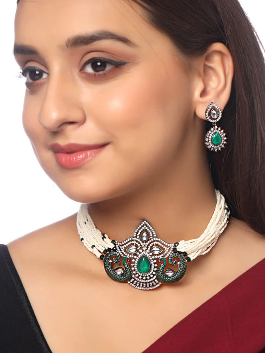 Kundan Jewellery Set for Women Ethnic Artificial Beads Green Peacock Traditional Choker Necklace Set for Women and Girls.