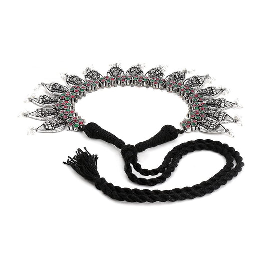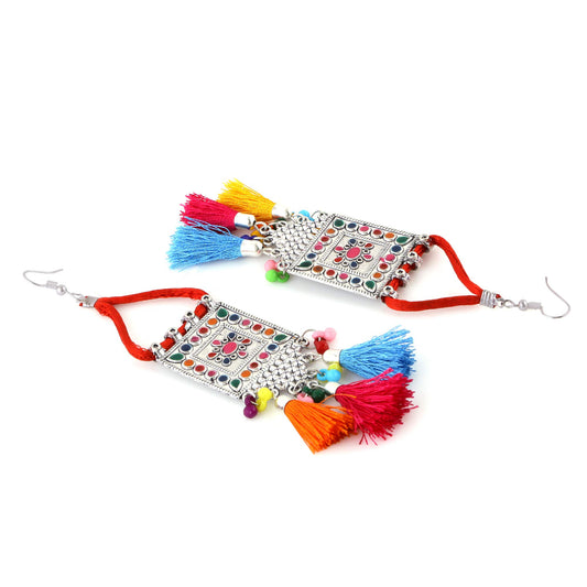 German Silver Oxidised Afghani Style Meenakari Touch Tassel with Cotton Threads Choker Necklace Set with Earrings Jewellery Set for Women & Girls (MultiColor) (Multicolor)