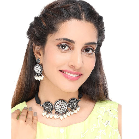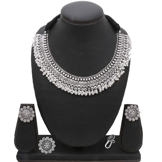 Ethnic German Silver Oxidised Choker Necklace Set with Earrings Traditional Jewellery Set for Women and Girls