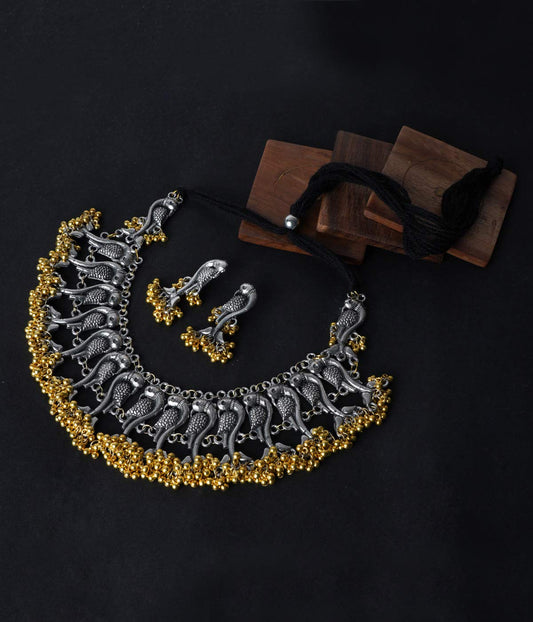Oxidised Jewellery Set for Women Silver Oxidised Jewellery Set Antique Peacock Carved Choker Necklace Set for Women and Girls