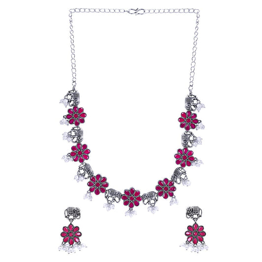 Ethnic German Silver Oxidised Pink studded Stones Elephant and Flower Design Choker Necklace Set with Earrings Traditional Jewellery Set for Women and Girls, Medium (YCTJNS-58ELEFLW-PK)