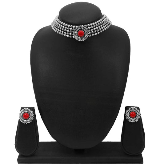 Jewellery Set for Women and Girls Traditional Silver Oxidised Jewellery Set Red Choker Set | Floral Shaped Choker Necklace Set for Women | Birthday Gift For Girls and Women Anniversary Gift for Wife