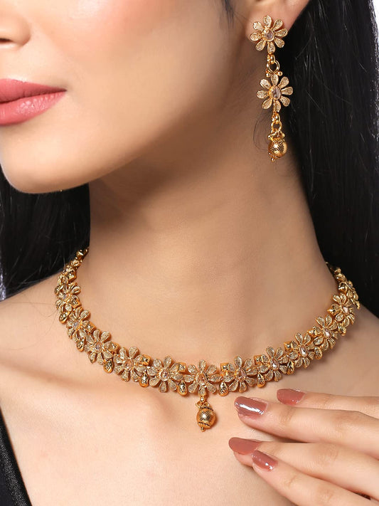 Jewellery Set for Women Gold Toned Floral Designed White Crystal Studded Choker Necklace Set with Earrings for Women and Girls