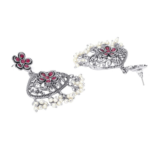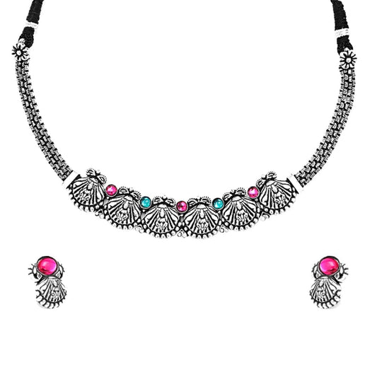 Classic German Silver Oxidised Pink Studded stones Flower Peacock Design Pearl moti Hand made Dori Thread Traditional Choker Necklace Set for Women and Girls, Medium
