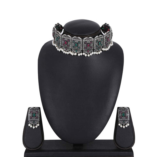 Jewellery Set for Women and Girls Traditional Silver Oxidised Jewellery Set Silver Choker Set | Studded Stone Choker Necklace Set for Women | Birthday Gift For Girls and Women Anniversary Gift for Wife