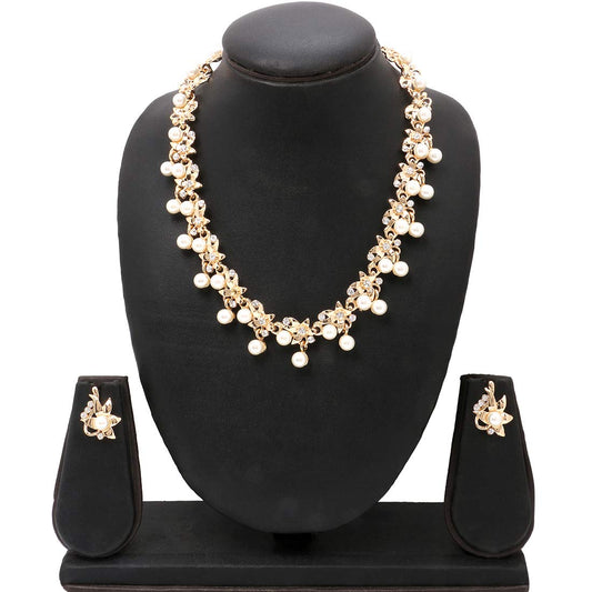 Jewellery Set for Women Gold Toned White Crystal Studded Floral Designed Choker Necklace Set with Earrings for Women and Girls