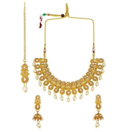 Ethnic Gold Plated Studded Kundan Pearl Moti Beads Jewellery Set Traditional Choker Necklace Set with Earrings and maang Tikka for Women and Girls