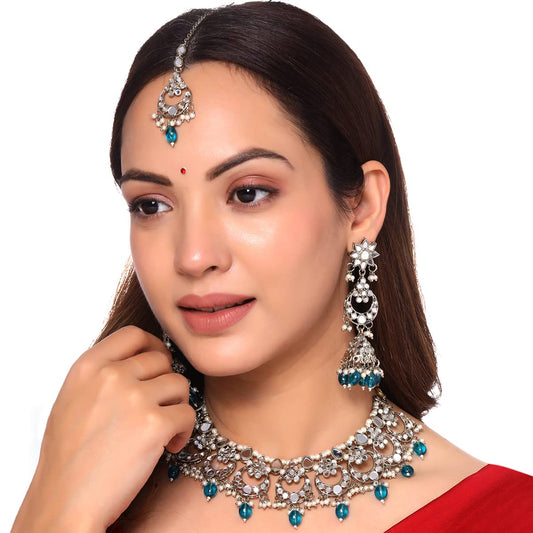 Jewellery Set for Womens Silver Oxidised Green Stone Studded Pearl Drop Designed Coker Necklace Set for Women and Girls