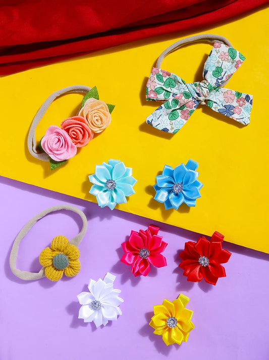Melbees by Combo of 3 Stretcheable Hair Bands and 6 Floral Big Hair Clips Hair Accessories for Baby Infant (Pack of 9), Multi-Color, Medium