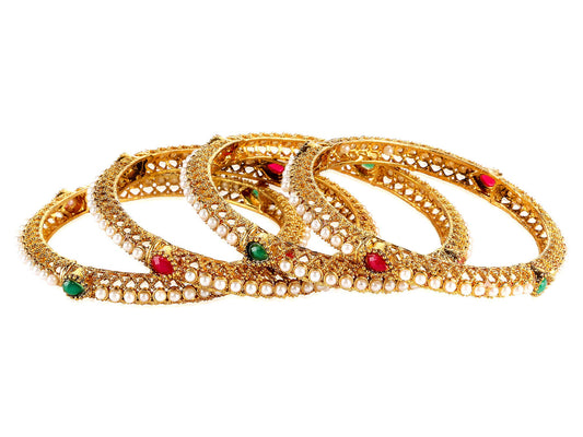 4 Pc Traditional Moti Craftmanship by Gold Plated and Pearl Bangle Set for Women (Gold, White) (YCFJBG-03MTIB-WH-26)