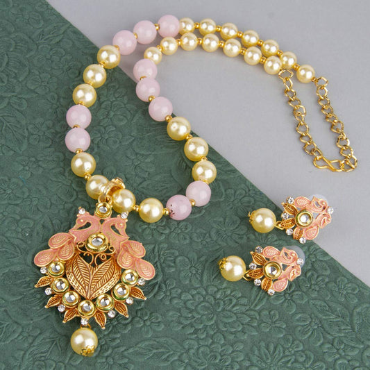 Exclusive Traditional Floral Peacock Desaign Pearl Kundan Necklace with Drop Earrings for Women