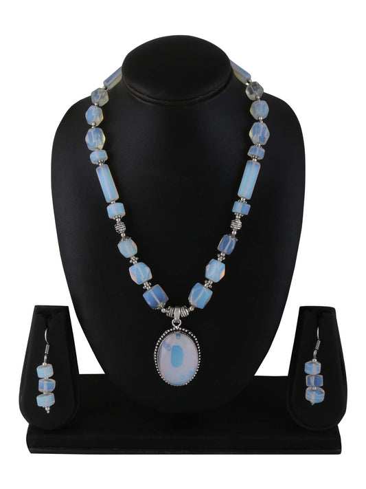 German Oxidized Silver Ethnic Moonstone Quartz Beads Beautiful Handmade Designer Necklace Set with Earrings Jewellery Set for Women and Girls (White)