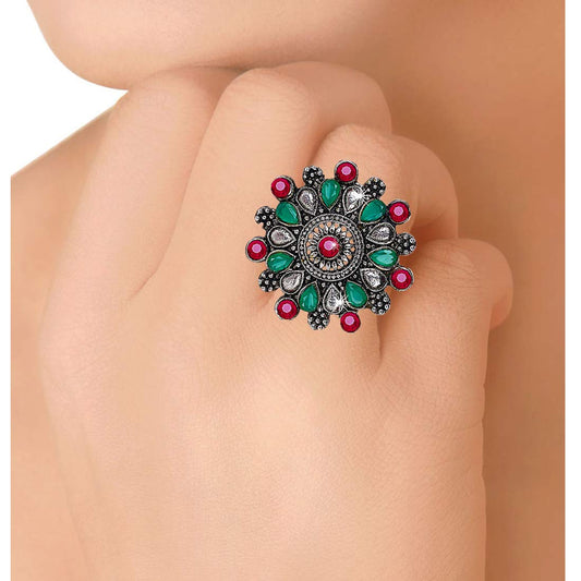 Floral Charm Ruby Stones Silver Oxidized Traditional Adjustable Ring for Women