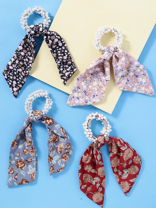 4 Pcs Chiffon Soft Cloth 2 in 1 Design Printed Scrunchie Ponytail Holder with Bows Pearl Studded Hair Scrunchie Accessories for Women (Pack of 4), Multi-Color, Medium