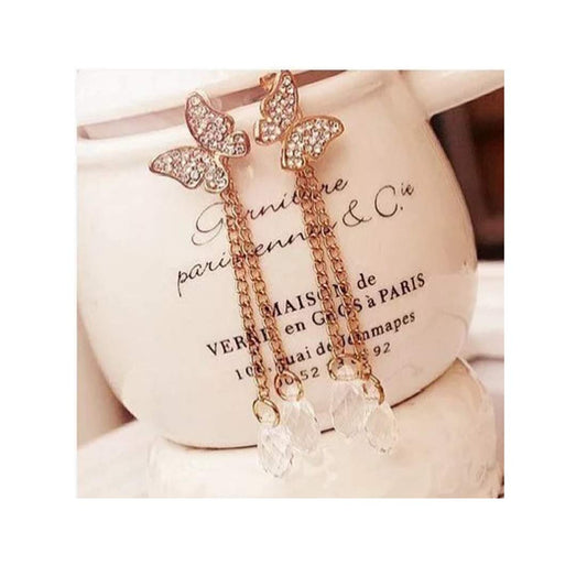 A Grade Crystal Needle Long Hanging Butterfly's Gold Plated Dangler Earrings for Women and Girls (Long Tassel Crystal Butterfly)