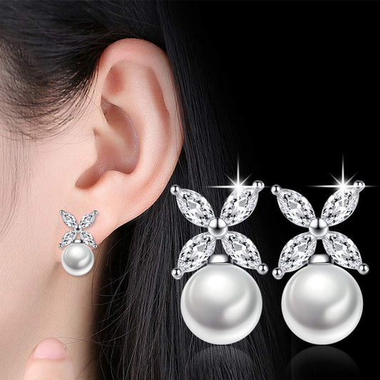 A5 Grade Crystal Stylish Latest Formal Casual Wear Evergreen White Pearl Studs Silver Plated Stud Earrings for Women and Girls (Floral Crystal)