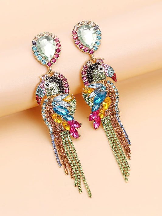Multicolor Stone Studded Parrot Shaped Dangle Earrings | 13 cm | Green