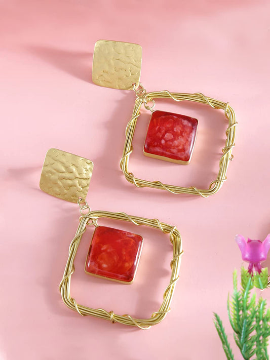 Elegant Red Stone Clip On Dangle Earrings - Gold Toned | 8.8cm | For Women & Girls