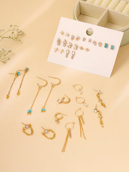 Stud Earrings for Women | Fashion Gold Earrings for Girls Combo of 17 Pairs Stud Hoop Earrings Set | Chain Hoops Set Earrings | Chic Reverie | Birthday Anniversary Gift For Girls Women