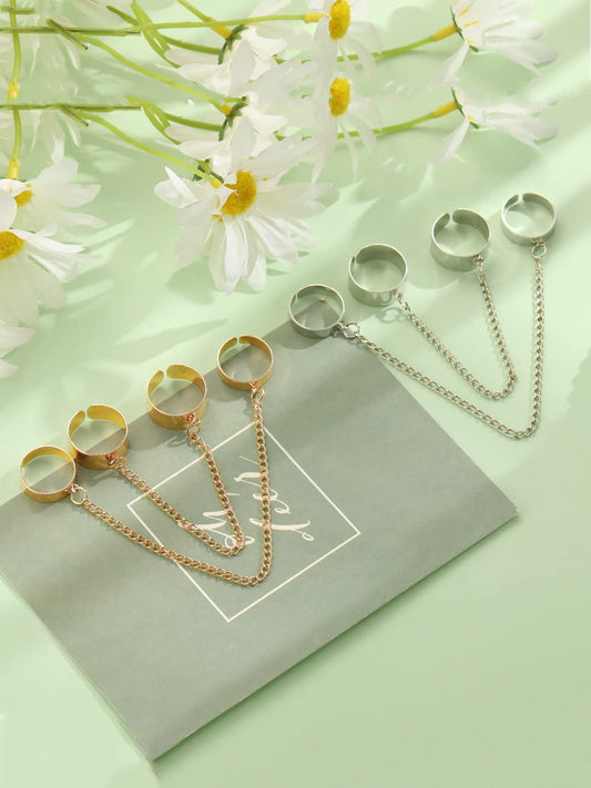 Rings for Women and Girls Chain Finger Rings | Adjustable 4 Pieces Silver Gold Punk Chain Finger Rings Four Fingers Open Ring | Birthday Gift For Girls and Women