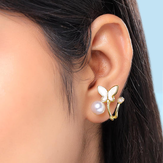 Earrings for Women and Girls Fashion Golden Stud Earrings | Gold Plated Butterfly Pearl Ear Hook Ear Cuff Jacket Stud Earrings | Birthday Gift for Girls and Women