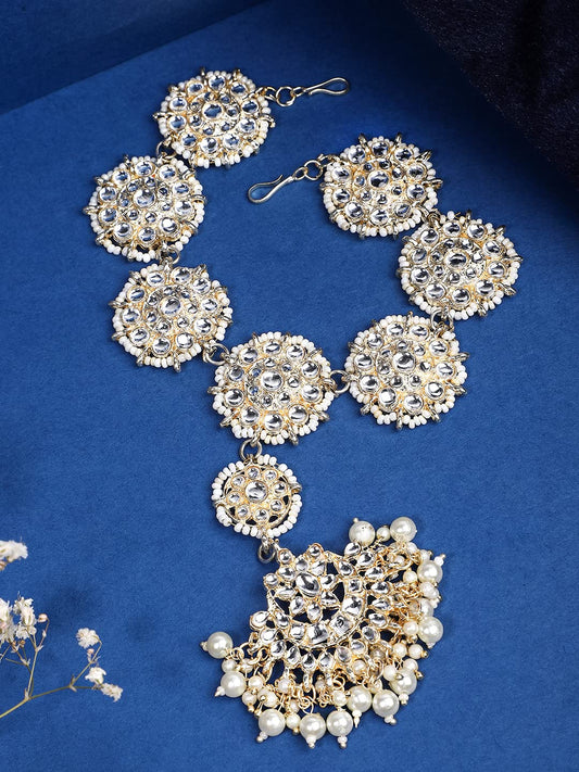 Mathapati for Women Gold Toned Kundan Studded Pearl Drop Chandbali Designed Head Chain/Mathapati for Women and Girls