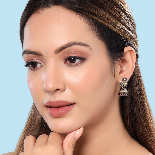 Earrings for Women Oxidised Gold Plated Peacock Designed Maroon Crystal studded Beads Drop Chandbali Drop Earrings for Women and Girls