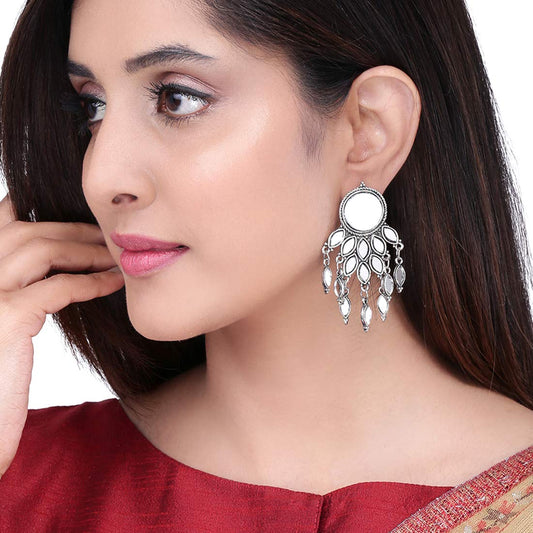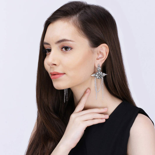 Designer Antique Afghani Kashmiri Style Tribal Lightweight Oxidized Silver Long Chain Dangle Earrings for Women and Girls (White)