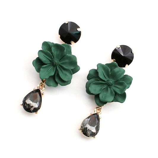 Classic Vintage Bohemia Green Flower Natural Stone Black Crystal Big Dangle Drop Earrings For Women and Girl's