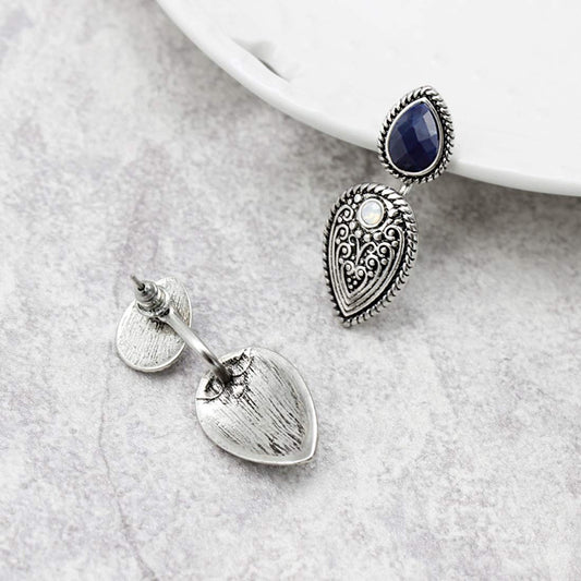Elegant Antique Style Oxidized Silver Classic Blue Stone Water Drop Crafted Leaf Drop Earrings For Women And Girl's