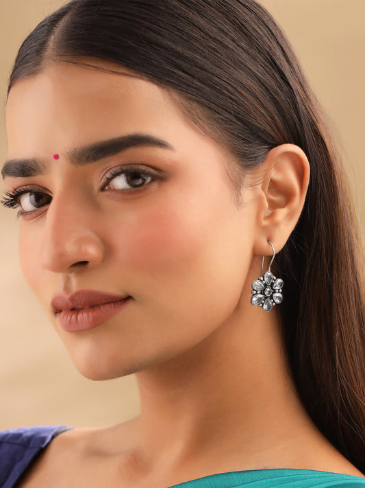 Earrings for Women and Girls | Traditional Silver Oxidised Drop Earrings Studded White Stone | German Silver Earring | Floral Drop Earrings | Accessories Jewellery for Women | Birthday Gift For Girls and Women Anniversary Gift for Wife