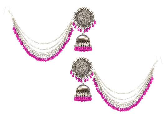 Earrings for Women and Girls | Traditional Pink Studded Stone Silver Oxidised Jhumka | German Silver toned | Birthday Gift For Girls and Women Anniversary Gift for Wife