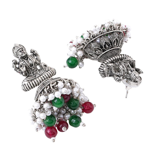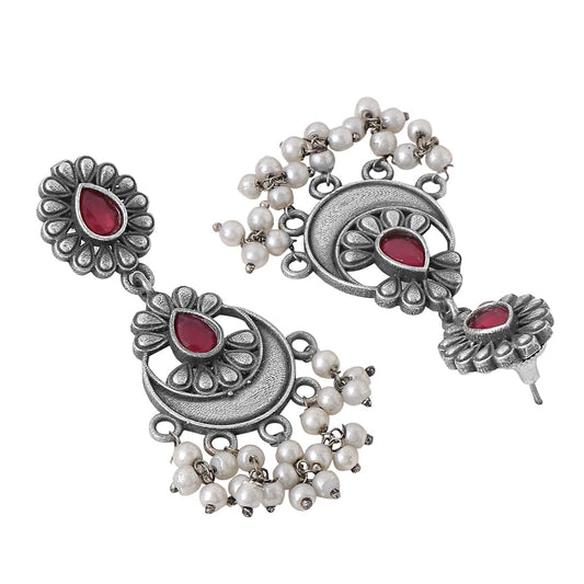 Earrings for Women Silver Oxidised Red Stone Studded Multicolor Beads Drop Designed Traditional Drop Earrings for Women and Girls