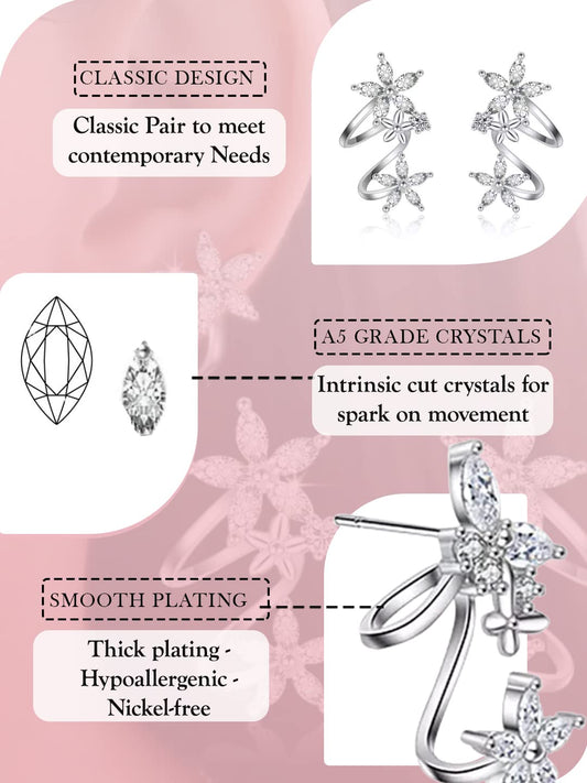 Earrings for Women and Girls | Fashion Crystal Stoned Silver Ear Cuff Earring | Silver Toned Ear Cuffs | Floral Designed Western Ear Cuffs | Accessories Jewellery for Women | Birthday Gift for Girls and Women Anniversary Gift for Wife