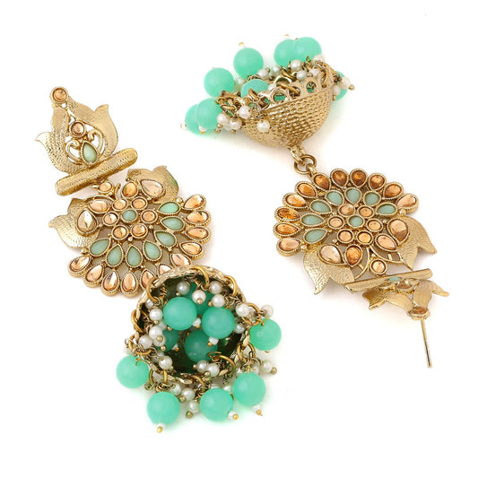 Ethnic Gold Plated Matte Finish Traditional Kundan Studded Floral Design Beads Dangler Earrings for Women and Girls, green, medium (YCTJER-780MEKFLW-GR)