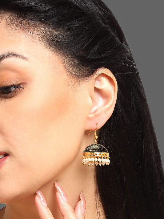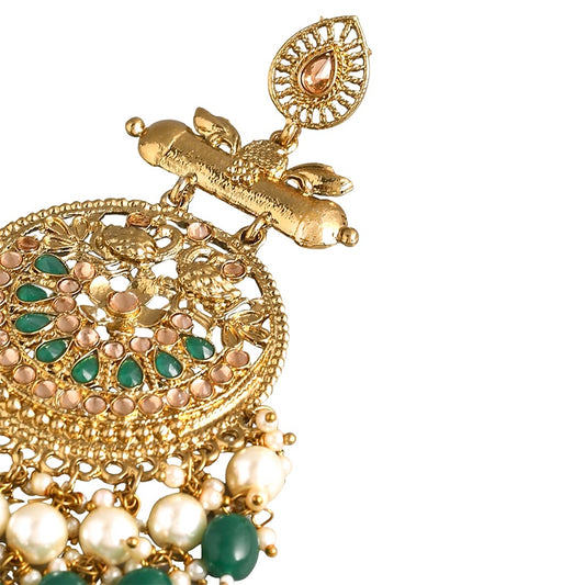 Ethnic Gold Plated Green Meenakari Touch Traditional Kundan Studded Floral Design Pearl moti Chandbali Earrings for Women and Girls, Gold, Green, Medium, YCTJER-84KDCHD-GR