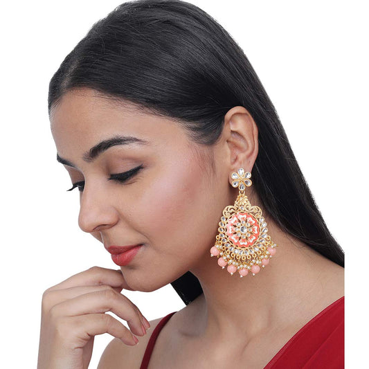 Ethnic Gold Plated Kundan Studded Pearl Dangler Earrings for Women and Girls, medium (YCTJER-626MFLW-PCH), gold, peach