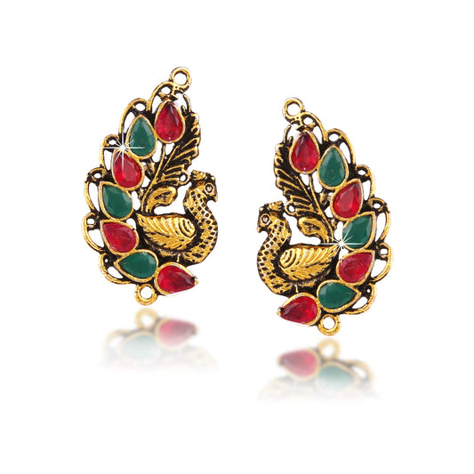 Indian Peacock Traditional Gold Plated Golden Red Green, Gold Copper Studs Earrings for Women