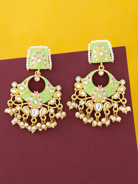 Ethnic Gold Plated Traditional Kundan Studded Pearl moti Pink Dangler Earrings for Women and Girls, Gold, Pink, Medium (Model: YCTJER-90LNGDG-PK)