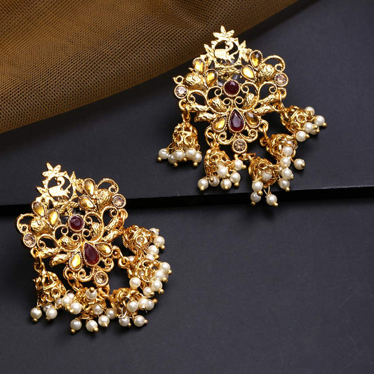 Floral Earrings for Women Gold Plated Metallic Red Colour Floral Petals Pearl Drop Earrings for Women and Girls