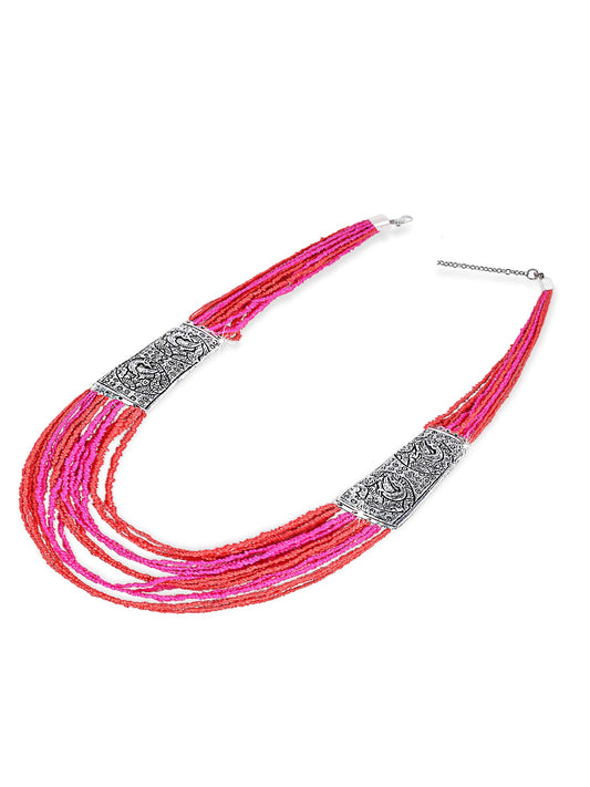 Designer Artistic Handmade Afghani Tibetan Style German Silver Oxidized Mulit Layer Beads Long Necklace Women and Girls (Pink)
